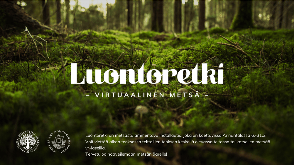 Luontoretki is a virtual installation about Finnish forrest by Tero Kaipanen. Aim of this installation was to bring the experience and memories of Finnish forrest for people at retirement homes and senior care facilities. Installation consists of staged space and a video that is viewed by virtual glasses and/or by projection in the space.